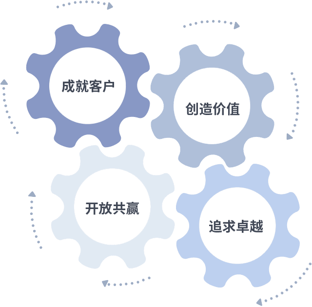 成就客户是一切决策的出发点,,,,创造价值是衡量所有工作的标准,,,,追求卓越是我们做事做人的态度,,,开放共赢是我们的格局也是最终的结果。。。。价值观的齿轮环环相扣,,,,推动着组织里的每个人不断向前。。
